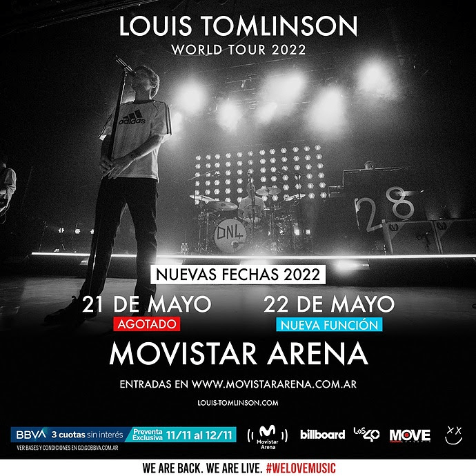 El cantante británico Louis Tomlinson ha confirmado sus nuevas fechas para 2022 y en Argentina el show AGOTADO tendrá lugar el 21 de mayo, en Buenos Aires, en el Movistar Arena. Como el espectáculo en Argentina se ha agotado desde 2020, la gira ha logrado dar cabida a una nueva actuación en Buenos Aires: La nueva fecha tendrá lugar el 22 de mayo del 2022, también en el Movistar Arena..Por primera vez en Argentina desde su carrera solista , Louis Tomlinson presenta su primera gira mundial en apoyo de su álbum debut en solitario, «WALLS», que fue lanzado en enero de 2020. Con su carrera en solitario, Louis Tomlinson ya puede ser considerado uno de los las mayores sensaciones de la música pop en la actualidad: la cantante ya ha alcanzado el sorprendente hito de los MIL MILLONES de la transmisión en Spotify.